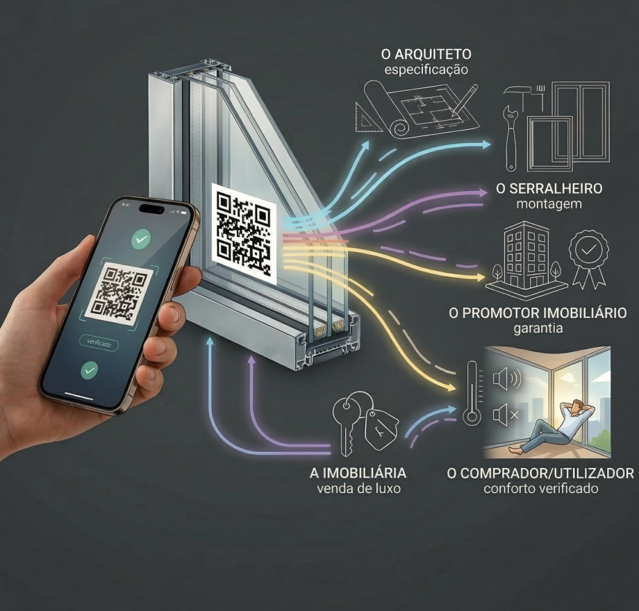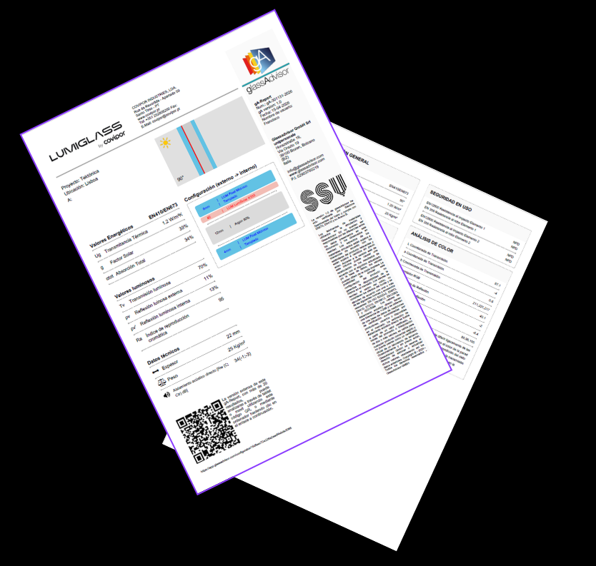 Acesso imediato aos coeficientes reais de transmissão térmica (Ug), fator solar (g), fatores luminosos, isolamento acústico (dB), segurança e ou resistência à intrusão, contribuindo para a validação da eficiência energética do edifício.